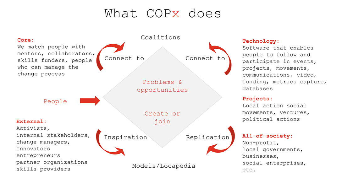COPx is be a non-profit franchise built on simple and universal principles. In the hands of locals who know best what’s possible on the ground, the millions engaged will be digitally connected, becoming the globally visible common brand beyond the limits of national borders.